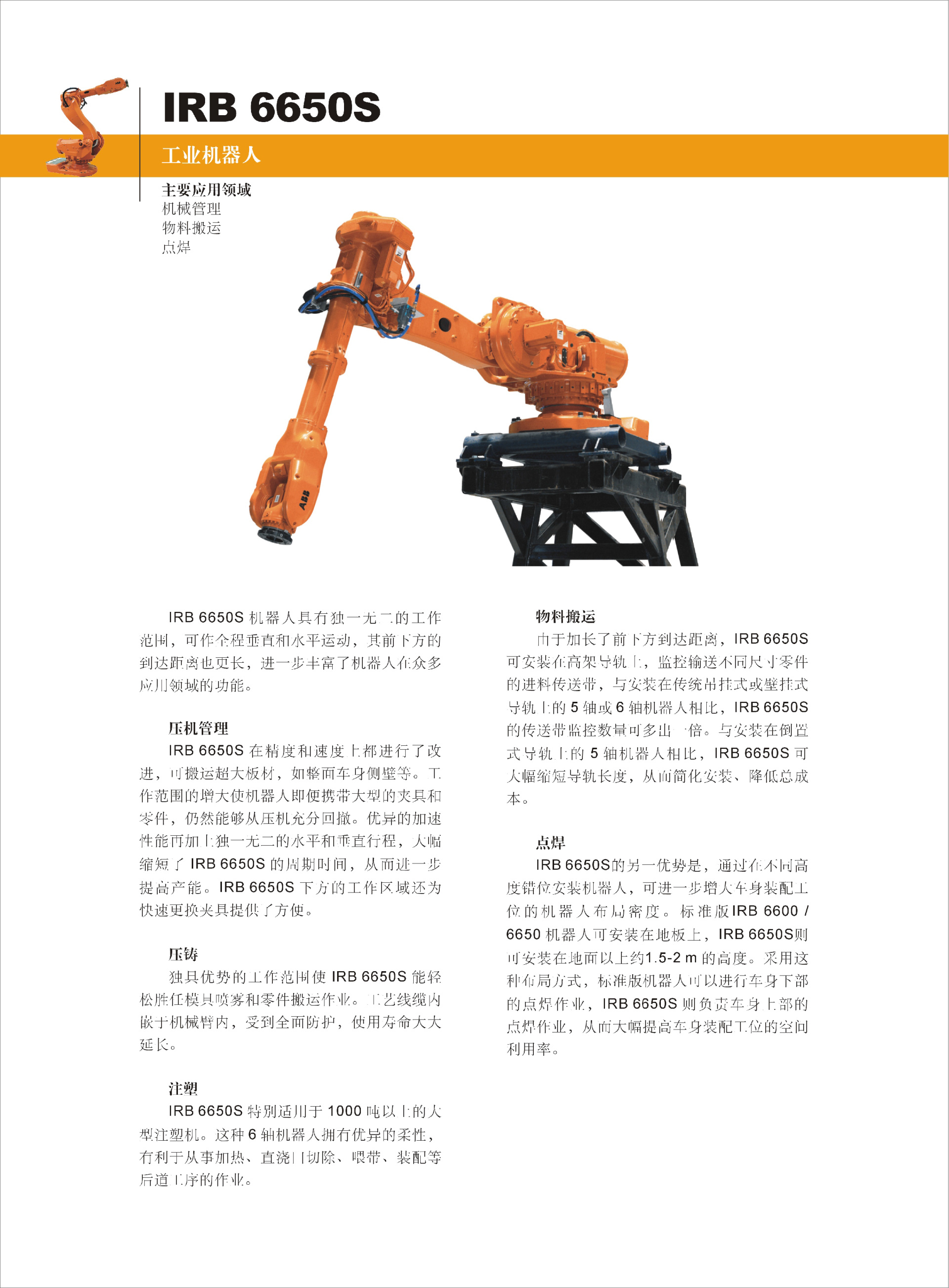 IRB 6650S在粘度和速度上都進行了改 進,可搬運超大板材,如整而車身側(ce) 壁等。工作範圍的增大使機器人即便攜帶大型的夾具和 零件,仍然能夠從(cong) 壓機充分回撤。優(you) 異的加速 性能再加上獨一無二的水平和乖直行程,大幅度縮短了IRB6650S的周期時間。