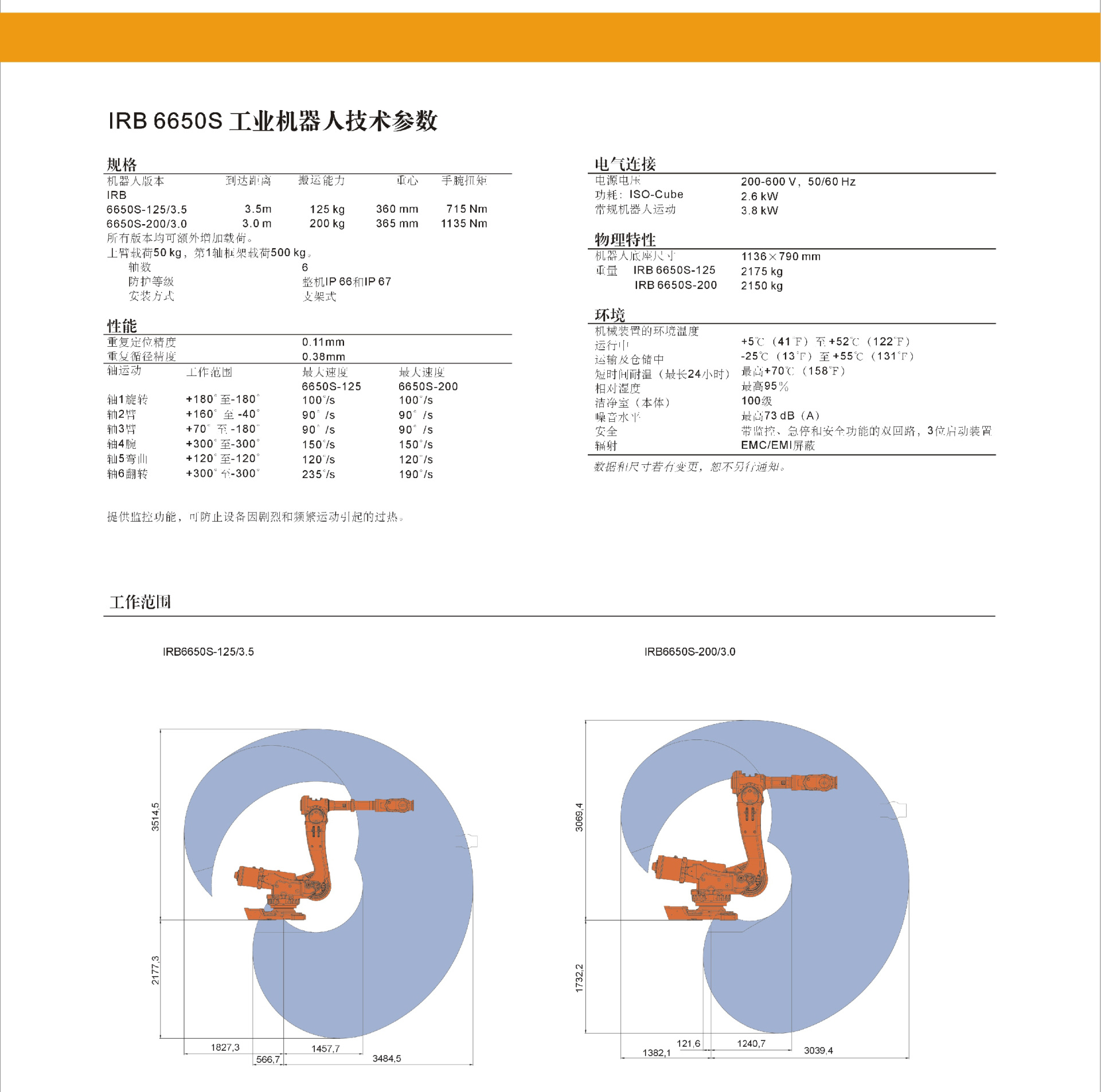 IRB 6650S機器人具冇獨一無二的工作 範圍,可作全程垂直和水平運動,其前下方的 到達距離也更長,進一步豐(feng) 富了機器人在眾(zhong) 多應用領域的功能。 IRB 6650S在粘度和速度上都進行了改 進,可搬運超大板材,如整而車身側(ce) 壁等。工作範圍的增大使機器人即便攜帶大型的夾具和 零件,仍然能夠從(cong) 壓機充分回撤。優(you) 異的加速 性能再加上獨一無二的水平和乖直行程,大幅度縮短了IRB6650S的周期時間。